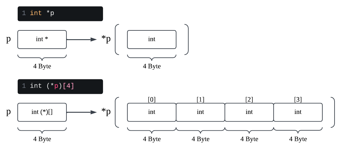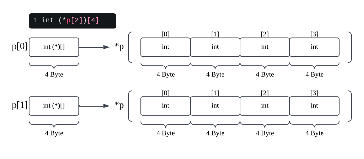char *p: Pointer to charint *p: Pointer to intint (*p)[4]: Pointer to Array(4 int)int *p[4]: Array of Pointer(4 int*)